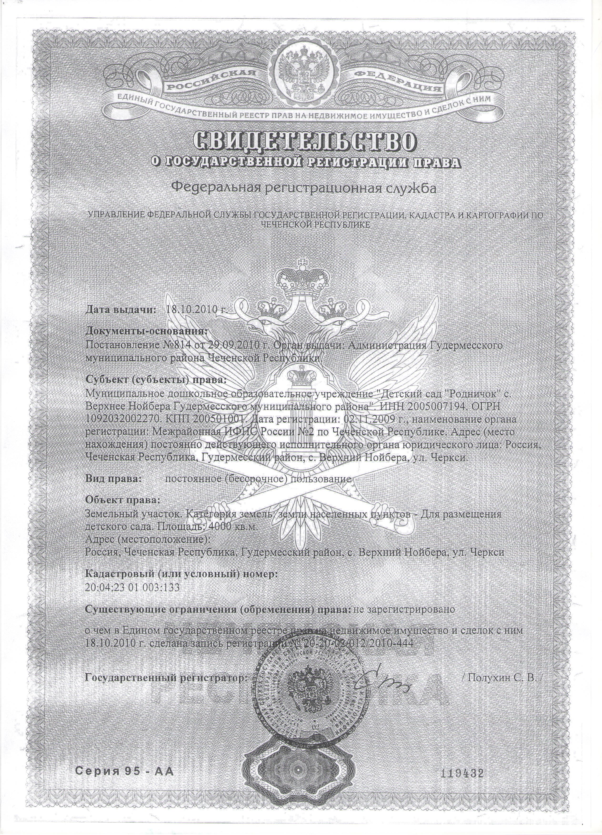 Свидетельство о государственной регистрации права (документ о закреплении территории)