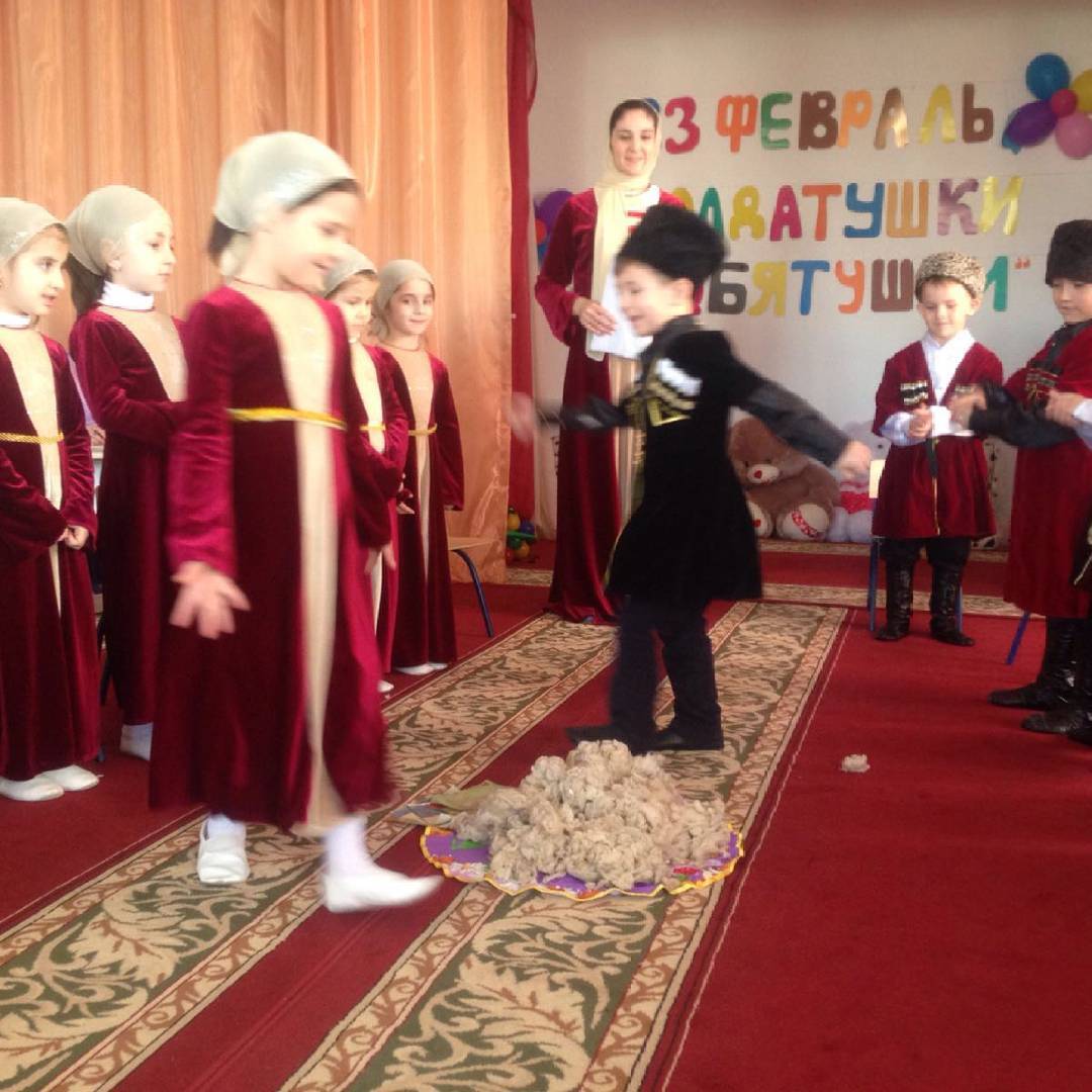 Перед началом конкурса воспитанники старшей группы исполнили гимн ЧР, читали стихи и пели песни о защитниках отечества. Зажигали лезгинкой для поднятия соревновательного духа у конкурсантов.