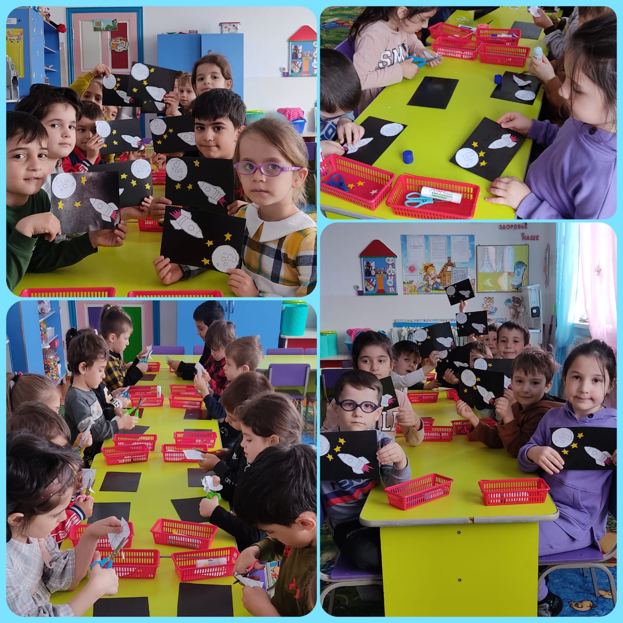 Цель:-формировать представление детей о космосе, учить красиво распологать изображения на листе бумаги, закреплять приёмы вырезания и наклеивания, развивать эстетическое чувство, умение составлять композицию