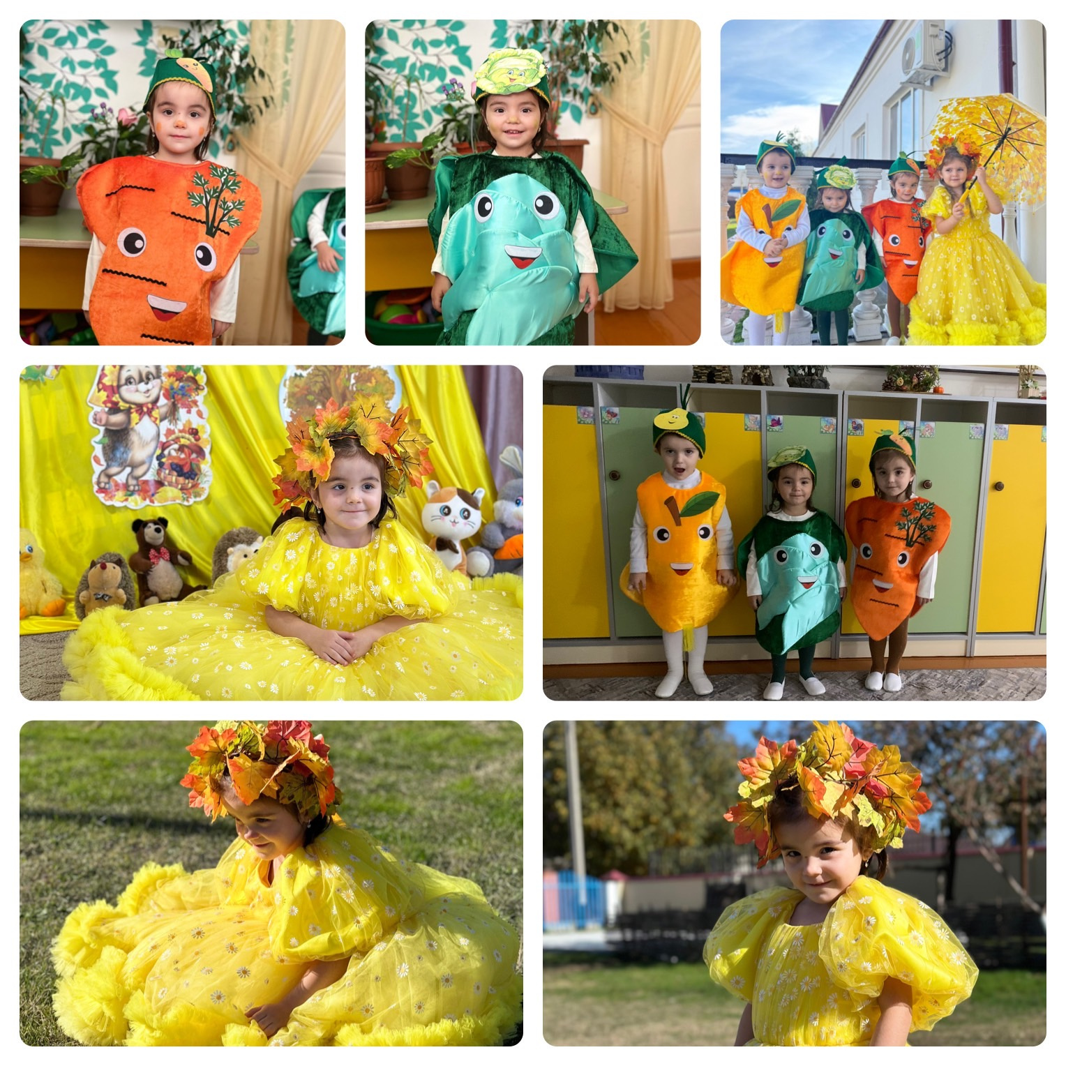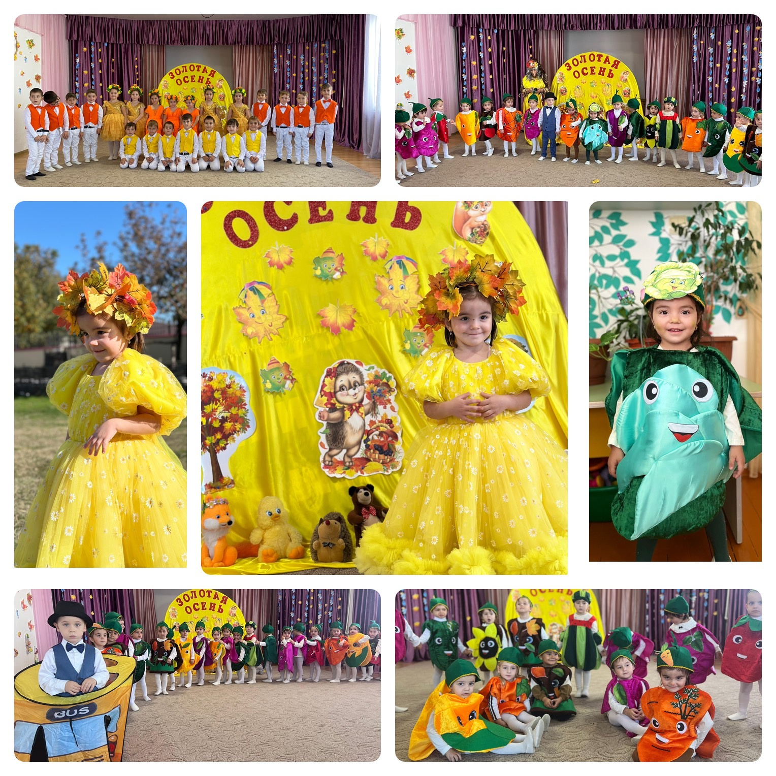 В гости, к ребятам приходила сама Осень-красавица, которую дети очень ждали. Вместе с Осенью ребята отправились в увлекательное путешествие -осенний лес и огород. На празднике дети перевоплощались в разных персонажей: зайчиков, грибочков, овощей; пели песни, водили хороводы, исполняли танцы, играли в веселые игры, отгадывали осенние загадки и рассказывали стихи. За весёлый праздник, Осень всех детей наградила сладкими подарками.