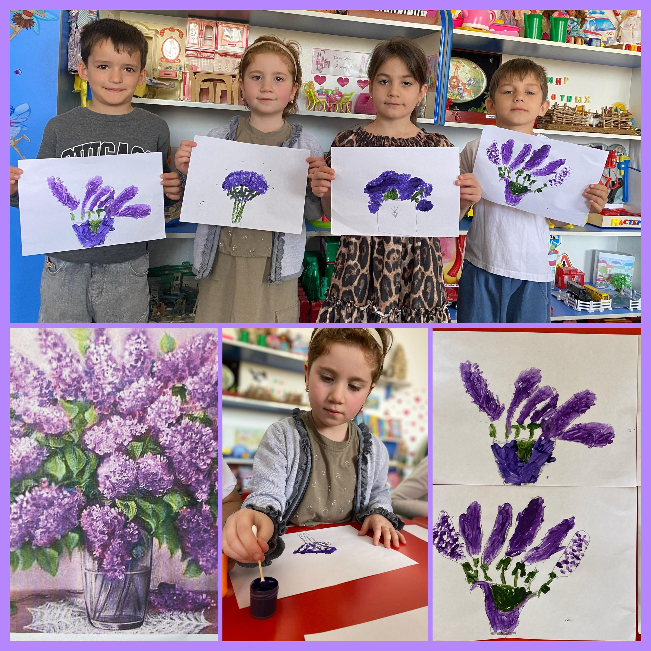 Цель:учить детей использовать различные виды техники нетрадиционного рисования,создать образ цветущей ветки сирени.