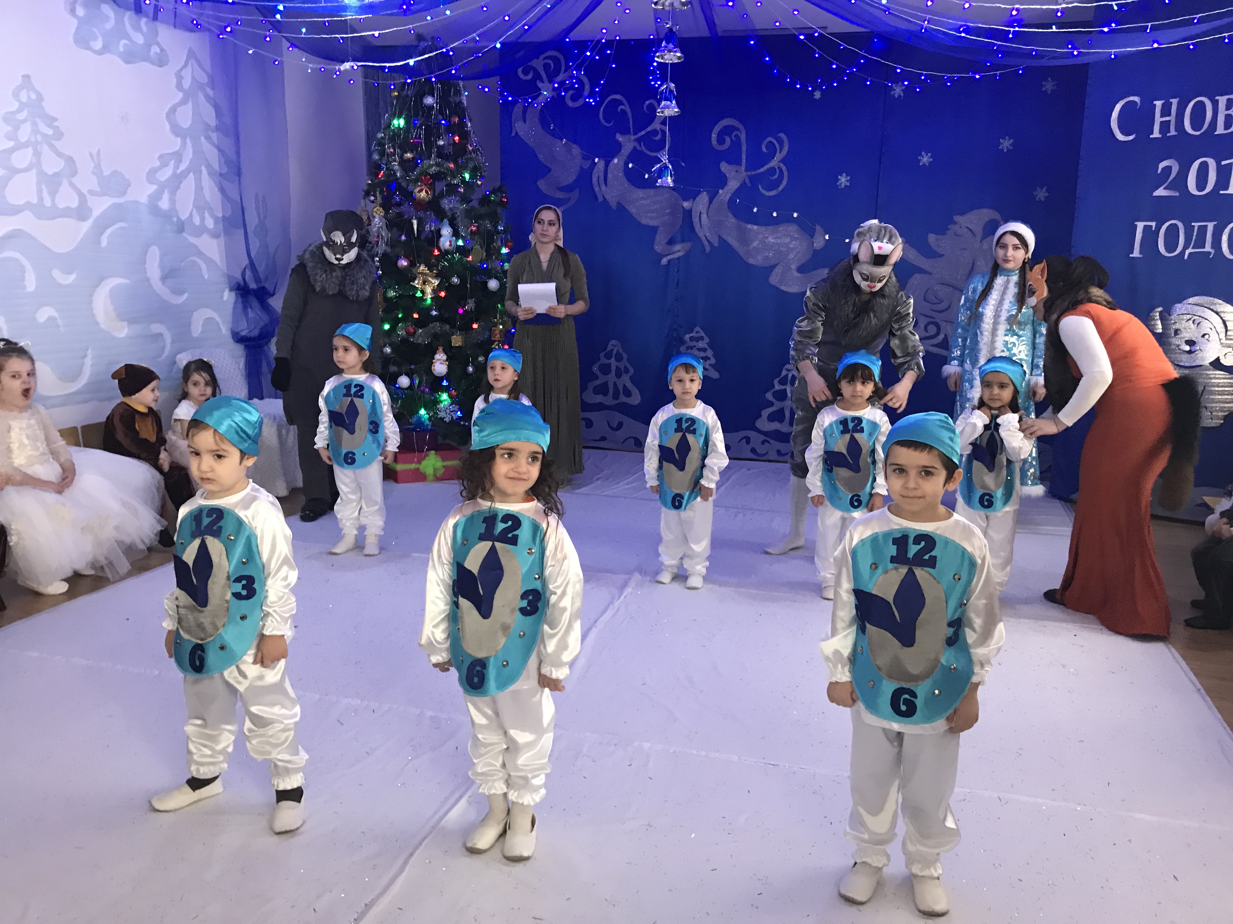 В детском саду «Родничок» с 28 по 29 декабря 2017 г. прошли новогодние утренники для детей. Самый любимый праздник, как взрослых, так и детей, конечно же, Новый год. Подготовка началась задолго до наступления праздников. Воспитатели с детьми разучивали стихотворения, проводили беседы на тему Нового года, новогодних традиций, музыкальный руководитель вместе с воспитателями разучивала с воспитанниками песни и пляски. Огромную работу провели по оформлению групп и музыкального зала. На сцене музыкального зала на голубом фоне - зимний пейзаж – на оленях Дед Мороз, сугробы, зайки под елками, символ года - собачка, (выполнена из пенопласта). В углу зала – украшенная ёлочка. Очень эффектно смотрелся навесной потолок из синей органзы с подцветкой, Оформление выполнили педагоги детского сада. Идея сюжета принадлежит педагогу-психологу Рукмановой Ларисе и воспитателю Гакаевой Жарадат, художник-оформитель музыкальный руководитель Хасуева Банати, главный помошник сторож Рукманов Муслим.