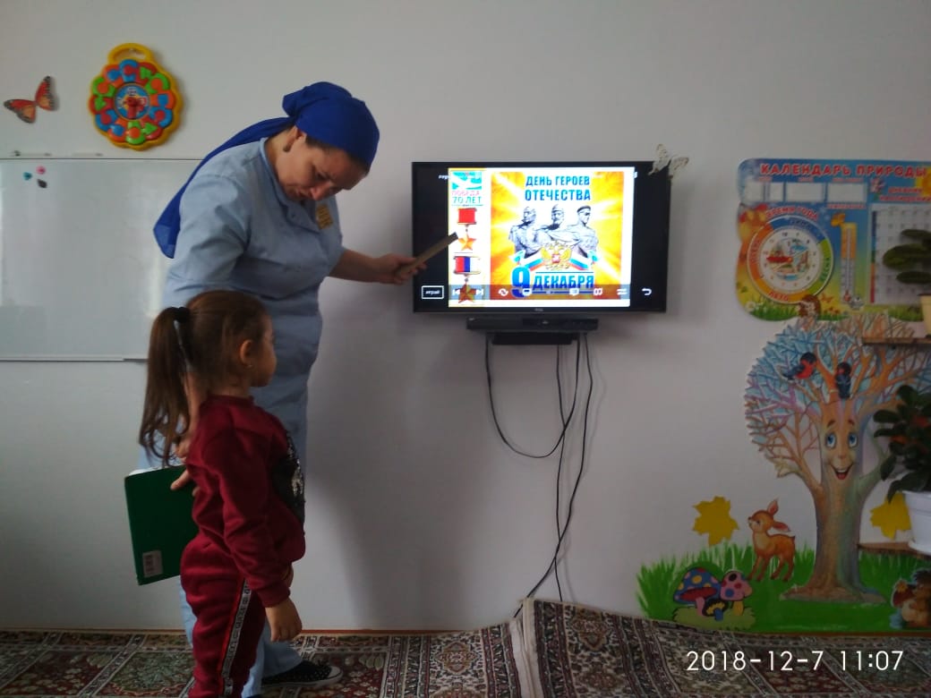 07.12.2018С 05 декабря по 07 декабря 2018 года в МБДОУ "Детский сад "Родничок" провели мероприятия посвященные празднику «День Героев Отечества», с целью познакомить детей с историей праздника, воспитывать любовь к Родине.