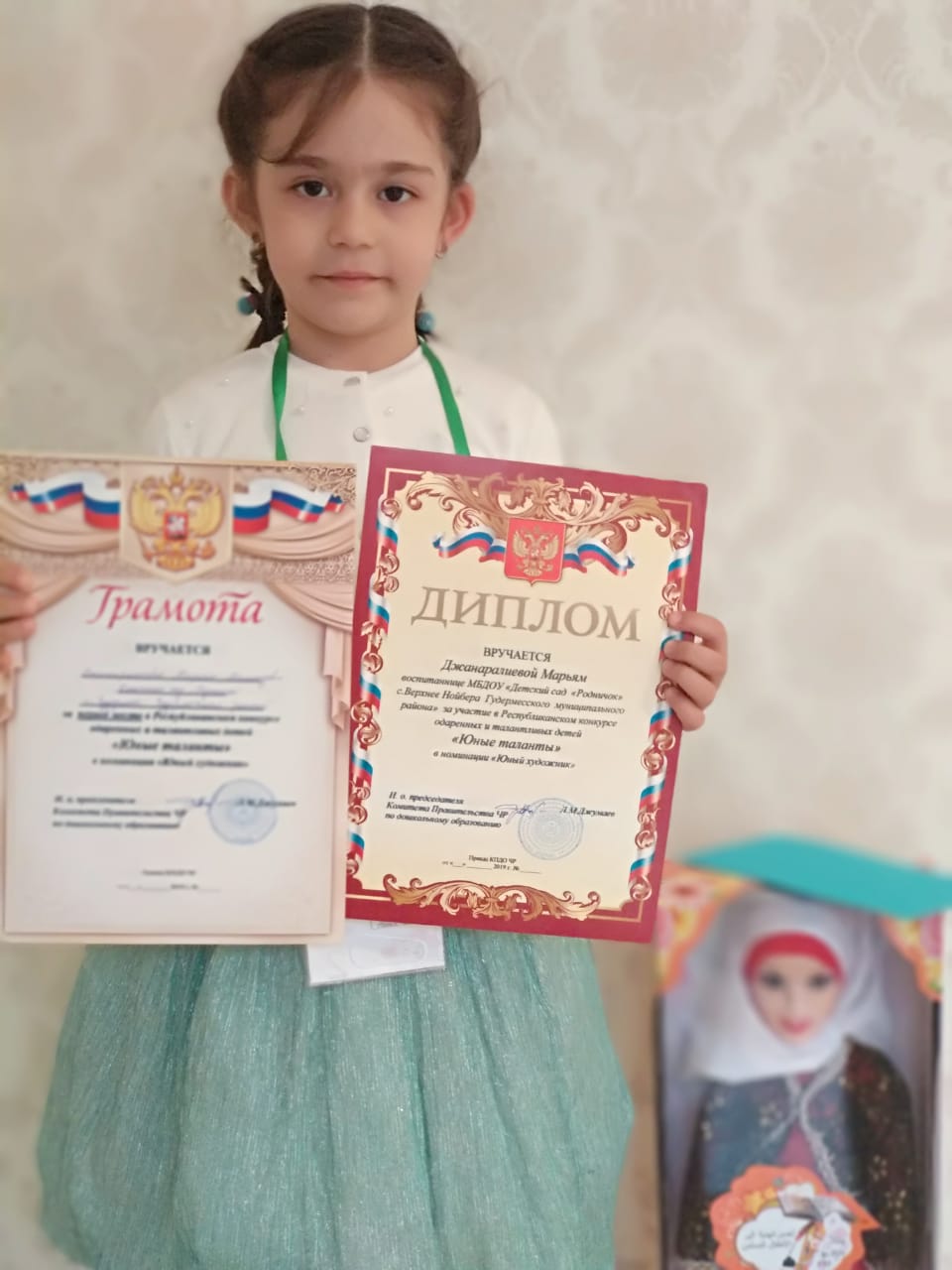 08.04.2019В Республиканском конкурсе "Юные таланты", организованном Комитетом правительства ЧР по дошкольному образованию для выявления юных талантов среди дошкольников, принимала участие наша воспитанница Жанаралиева Марьям.